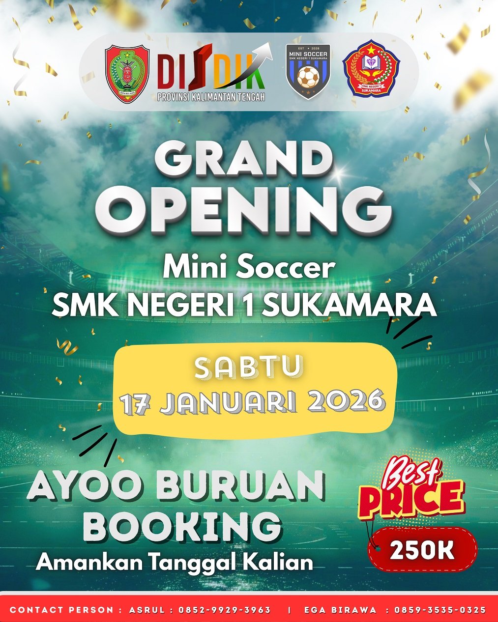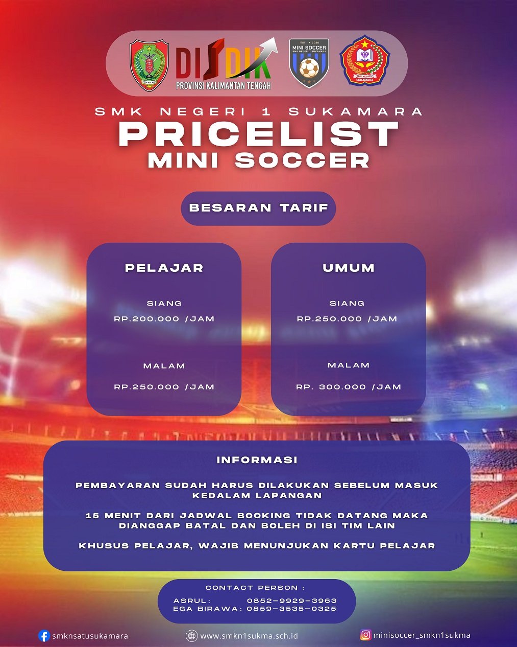 Telah dibuka untuk Umum dan Pelajar Minisoccer SMKN 1 Sukamara Mulai Tanggal 17 Januari 2026 hari sabtu. ayo buruan yang hobby bola silahkan booking dan amankan tanggal sesuai waktu kalian. silahkan bagi yang ingin booking lapangan dapat menghubungi kontak person kami yang tertera di brosur yang kami bagikan. terima kasih